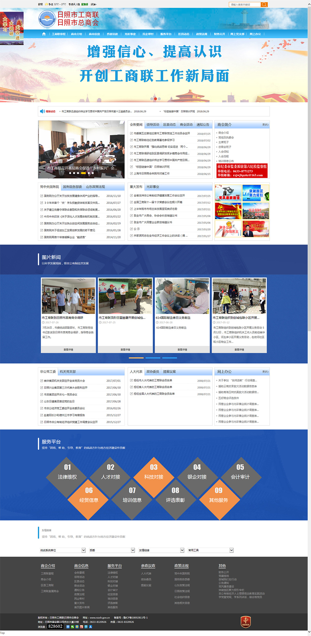 • 日照市工商業(yè)聯(lián)合會(huì)是中國(guó)共產(chǎn)黨領(lǐng)導(dǎo)的全市工商界組成的人民團(tuán)體和民間商會(huì),1952年7月組織籌建,1953年8月正式成立。1967年1月停止活動(dòng),1988年6月恢復(fù)工作。 日照市工商聯(lián)共有會(huì)員6169個(gè),其中企業(yè)會(huì)員4029個(gè),團(tuán)體會(huì)員125個(gè),個(gè)人會(huì)員2015個(gè)。4029個(gè)企業(yè)會(huì)員按行業(yè)分布情況為:農(nóng)林牧漁業(yè)為309個(gè),采礦業(yè)320個(gè),制造業(yè)1528個(gè),電力、熱力、燃?xì)饧八a(chǎn)和供應(yīng)業(yè)54個(gè),建筑業(yè)320個(gè),交通運(yùn)輸、倉(cāng)儲(chǔ)和郵政業(yè)85個(gè),信息傳輸、軟件和信息技術(shù)服務(wù)業(yè)135個(gè),批發(fā)和零售業(yè)390個(gè)
